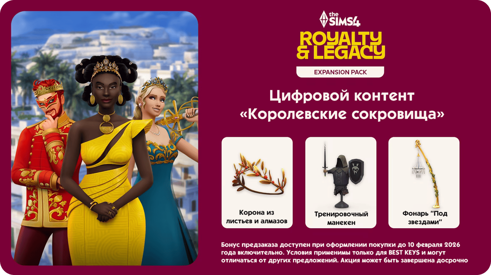 Бонус предзаказа доступен при оформлении покупки до 10 февраля 2026 года включительно. Условия применимы только для BEST KEYS и могут отличаться от других предложений. Бонусный контент предоставляется в виде отдельного ключа активации, требуется базовая игра The Sims 4. Акция может быть завершена досрочно