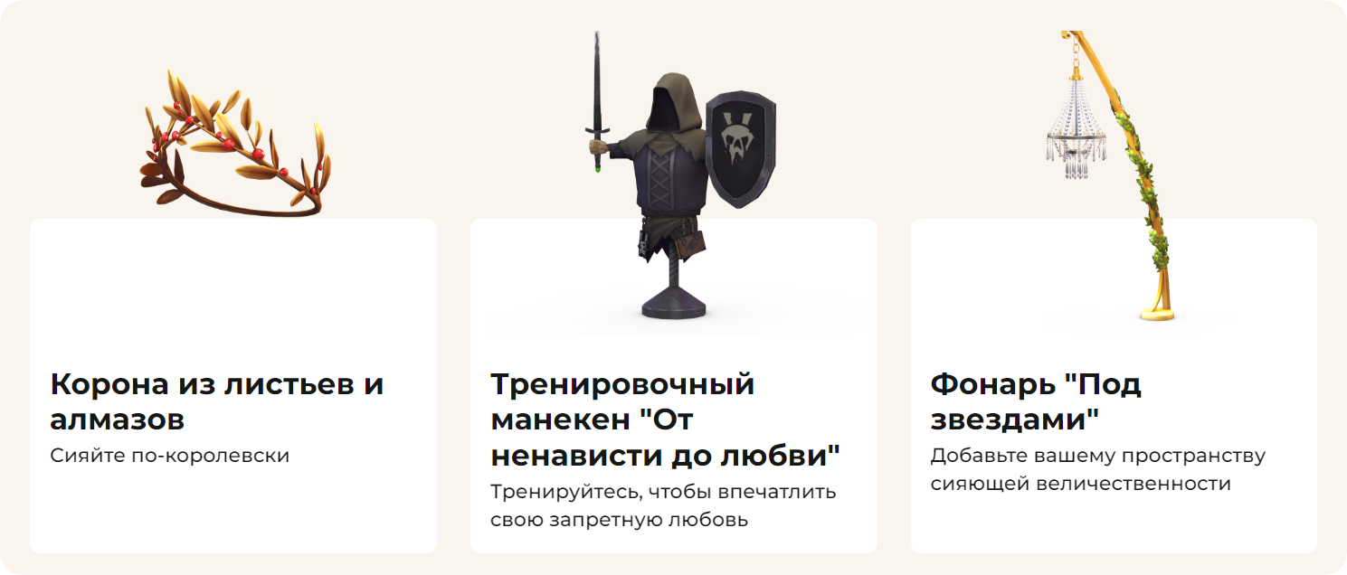 Излучайте королевское величие в короне из листьев и алмазов, потренируйтесь впечатлять запретную зазнобу с помощью тренировочного манекена «От ненависти до любви» и добавьте сияющего авторитета в свое пространство с помощью фонаря «Под звездами».